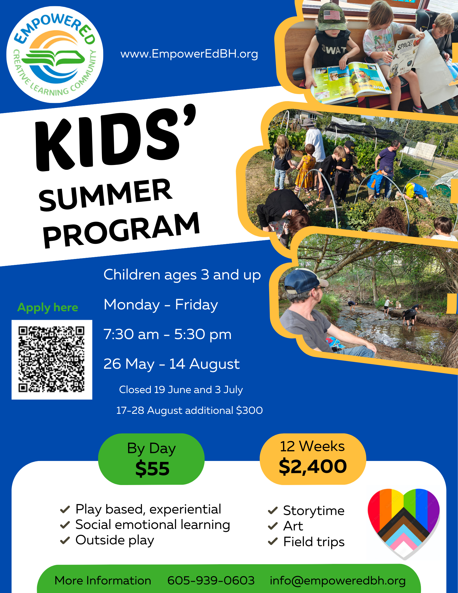 Identity: Kids’ gender, orientation, names, etc, are respected and honored. We strive to provide an environment where every kid feels safe, welcome, and accepted.